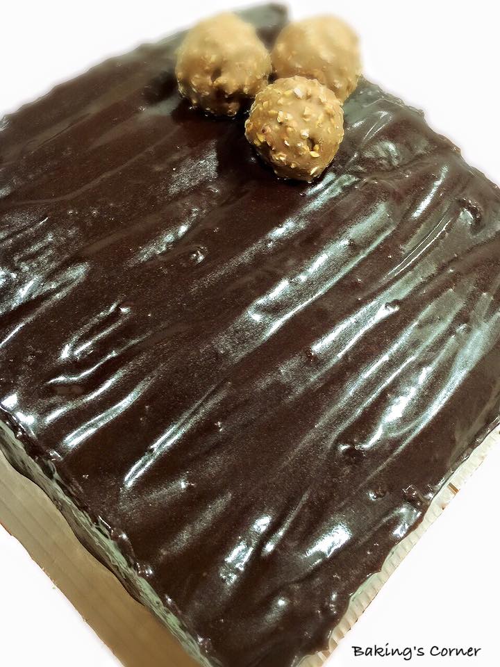 Pace a pc of aluminum foil below cake base (enough to cover whole cake) as you pour fudge mixture over your cake as the mixture will be slightly runny. As the mixture flows down, use a plastic dough cutter/spatula to smoothen top n scoop back to sides of cake (not to waste)